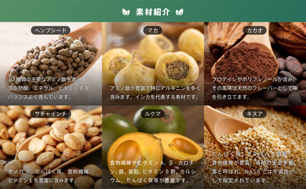 | 原材料 | ヘンプシード、アガベシュガー、カカオ、キヌア、チアシード、サチャインチ、ルクマ、バナナ、マカ |